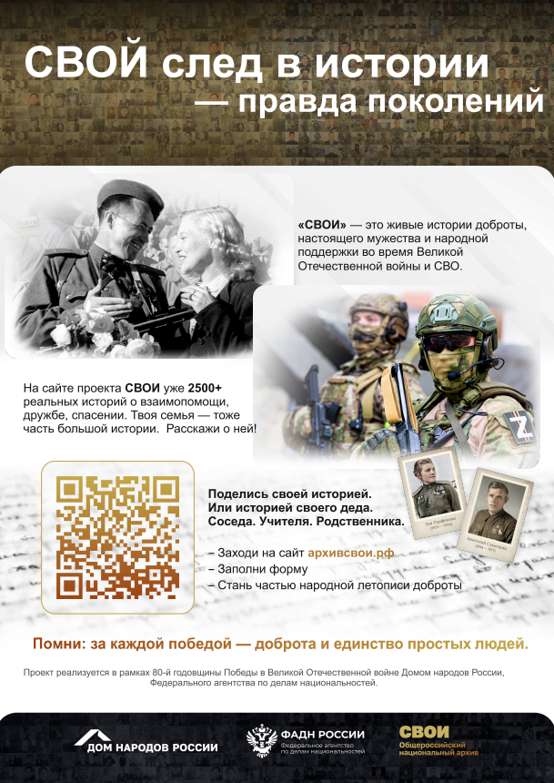 «СВОИ» - интернет-проект, в архиве которого насчитывается более 2,5 тыс. историй людей со всей страны. Это рассказы сыновей и дочерей, внуков и правнуков о героизме своих предков, взаимовыручке и дружбе представителей многонационального народа в годы войны, которые передаются из поколения в поколение уже почти 80 лет.