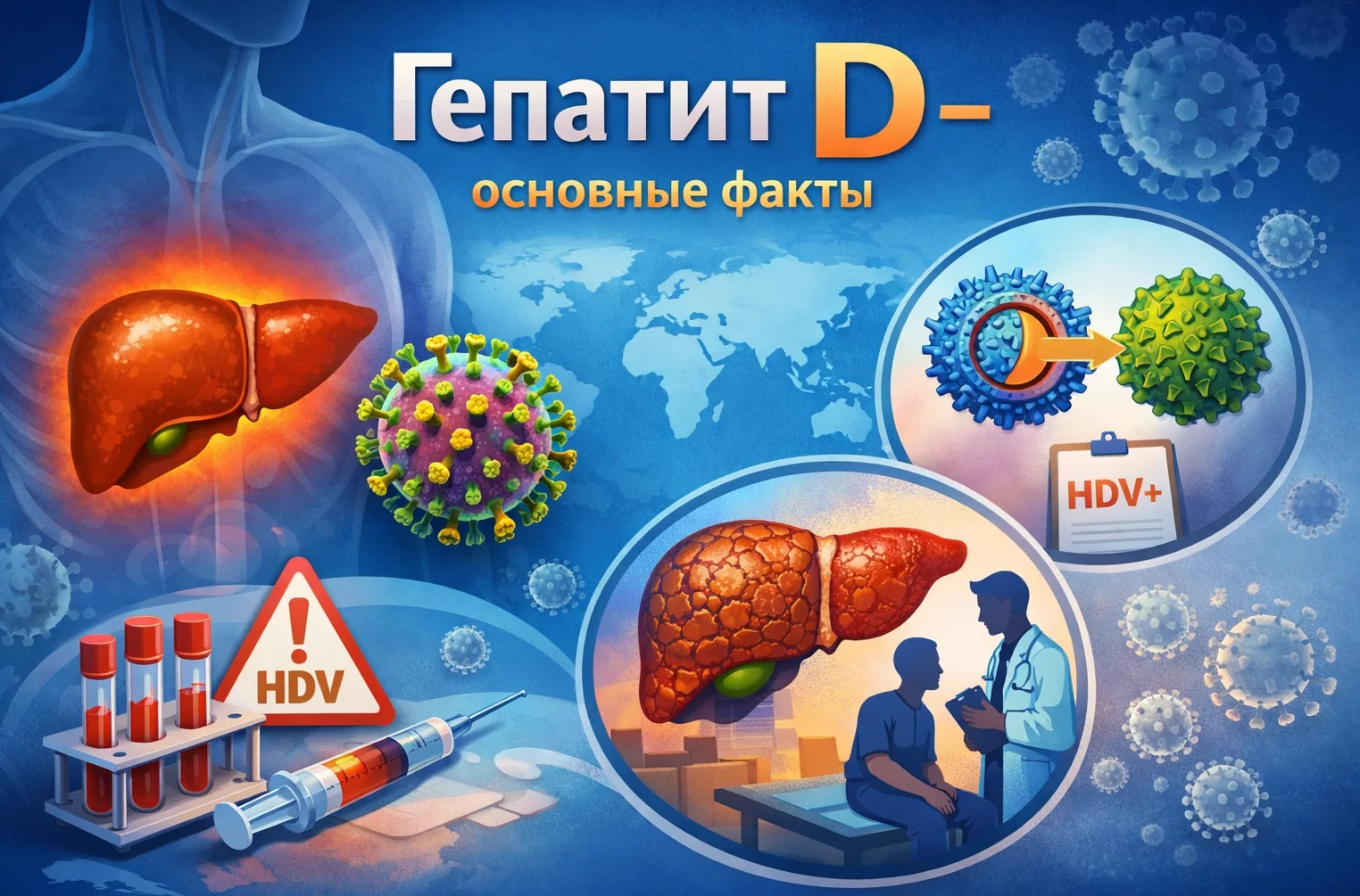 - Гепатит D – воспалительное поражение печени, вызванное вирусом гепатита D. Для заболевания характерно тяжёлое течение и неблагоприятный прогноз. Среди частых последствий данного заболевания – цирроз и печёночная недостаточность.