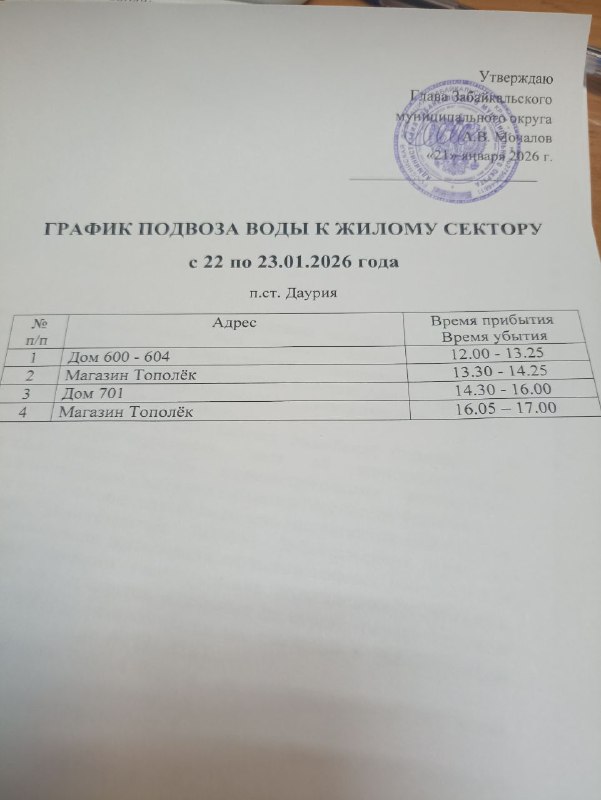 График подвоза воды к жилому сектору с 22 по 23.01.2026 года п.ст. Даурия Posted on Январь 22, 2026 Post navigation предыдущий пост предыдущий пост: В сезон гриппа и острых респираторных инфекций (ОРИ) общая задача – не допустить роста заболеваемости следующий пост следующий пост: Ротавирусная инфекция – меры профилактики