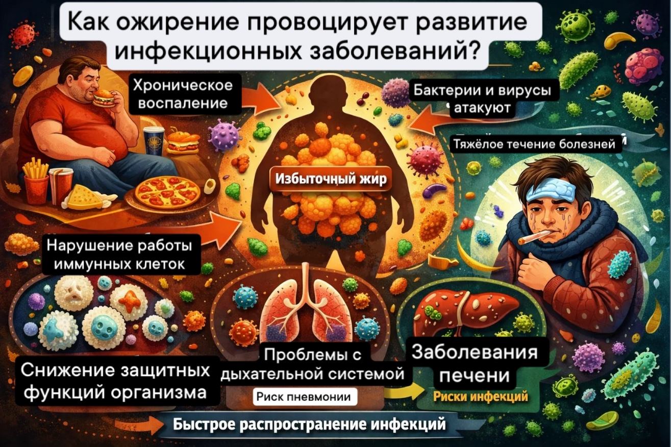 Ожирение давно признано фактором риска множества серьезных заболеваний, таких как сахарный диабет, гипертония, сердечно-сосудистые патологии. Но научные исследования последних десятилетий показали, что избыток массы тела существенно повышает уязвимость организма перед инфекционными болезнями. Рассмотрим подробнее механизмы, посредством которых ожирение способствует распространению инфекций.