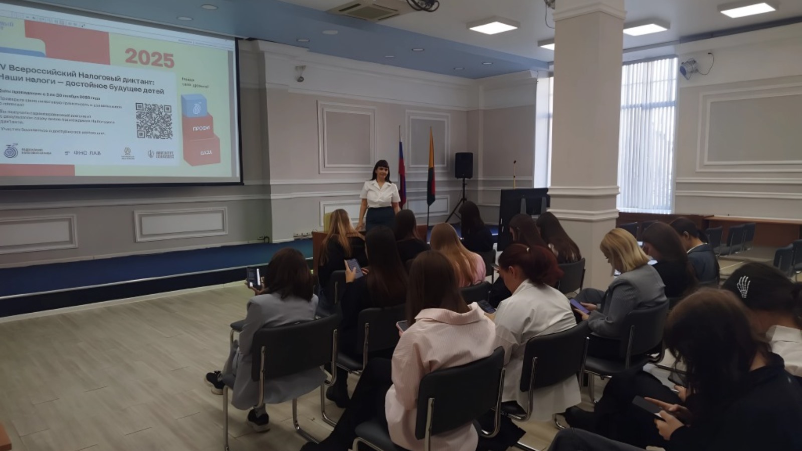 В завершении урока студенты приняли участие в налоговом диктанте. Трое студентов сумели набрать максимальный балл на базовом уровне. Все участники получили именные сертификаты.