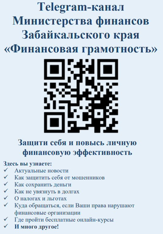 В рамках реализации Стратегии повышения финансовой грамотности и формирования финансовой культуры до 2030 года Министерством финансов Забайкальского края создан и функционирует официальный телеграм-канал «Финансовая грамотность Забайкальский край».