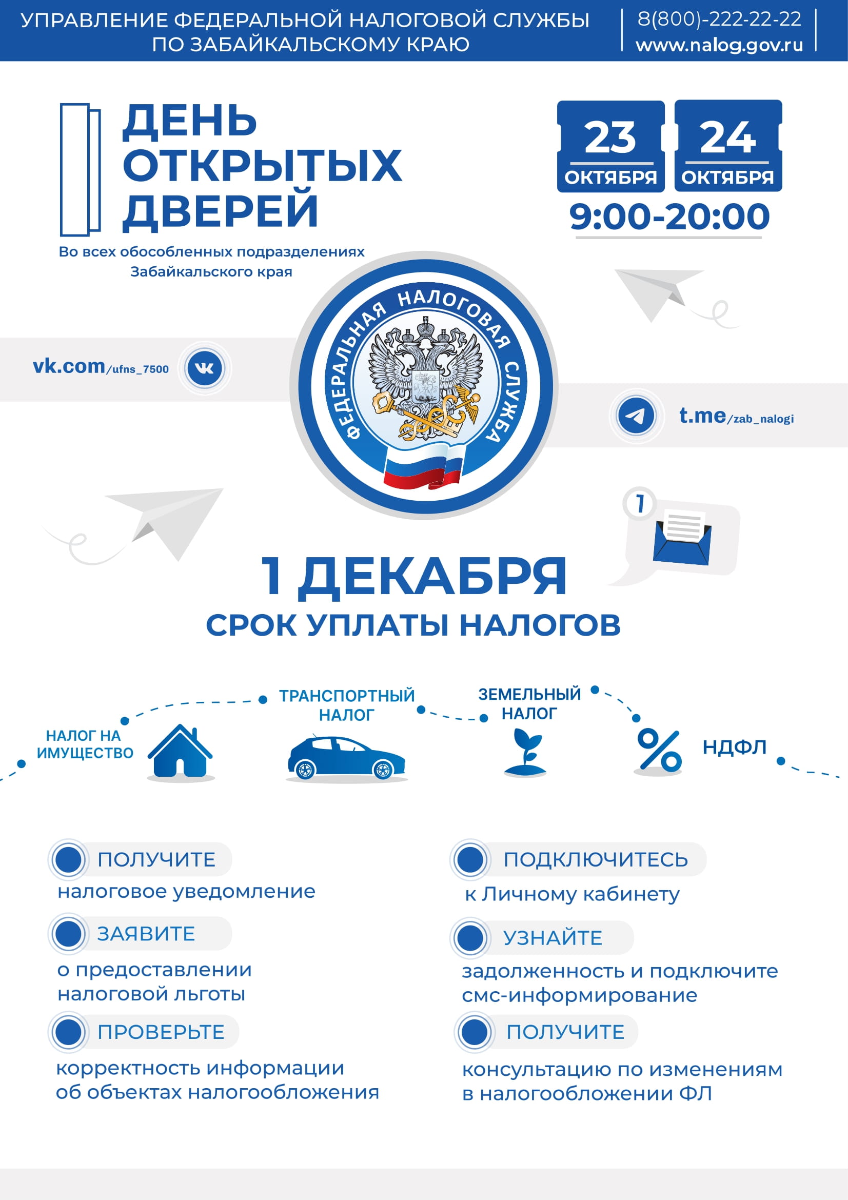 23 и 24 октября во всех обособленных подразделениях Управления Федеральной налоговой службы по Забайкальскому краю пройдут Дни открытых дверей для налогоплательщиков – физических лиц. Акция приурочена к проходящей кампании по уплате имущественных налогов и НДФЛ за 2024 год.