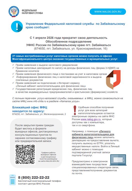 1 апреля 2026 года прекратит свою деятельность обособленное подразделение УФНС России по Забайкальскому краю Posted on Март 10, 2026 Post navigation предыдущий пост предыдущий пост: Геморрагические лихорадки и грызуны: угроза здоровью