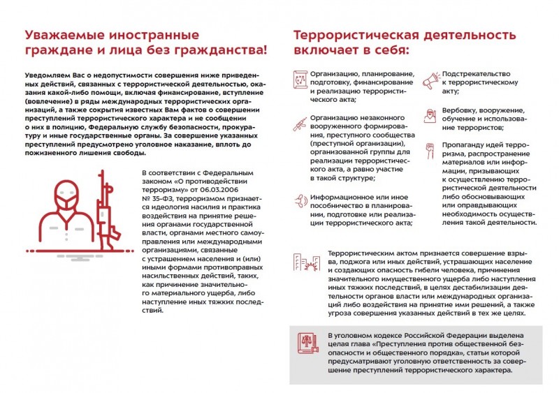 ПАМЯТКА для иностранных граждан и лиц без гражданства по разъяснению норм законодательства Российской Федерации, устанавливающих ответственность за участие и содействие террористической деятельности